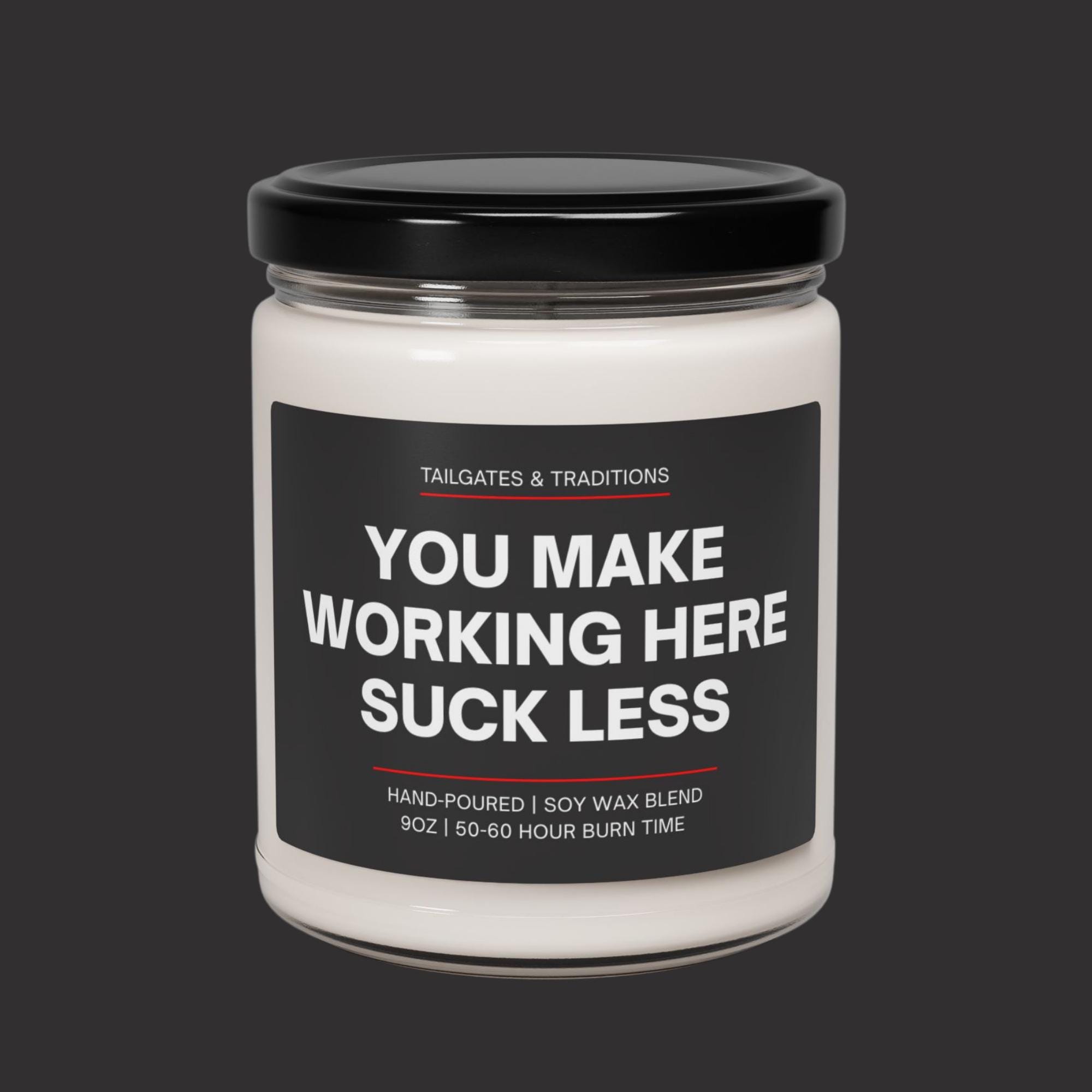 Our “You Make Working Here Suck Less” candle is the perfect funny workplace gift for your work bestie, favorite coworker, or office partner-in-crime. This adult humor candle makes a thoughtful coworker leaving gift, thank you gift, or bestie gift that adds laughter to any office, desk, or work-from-home setup.