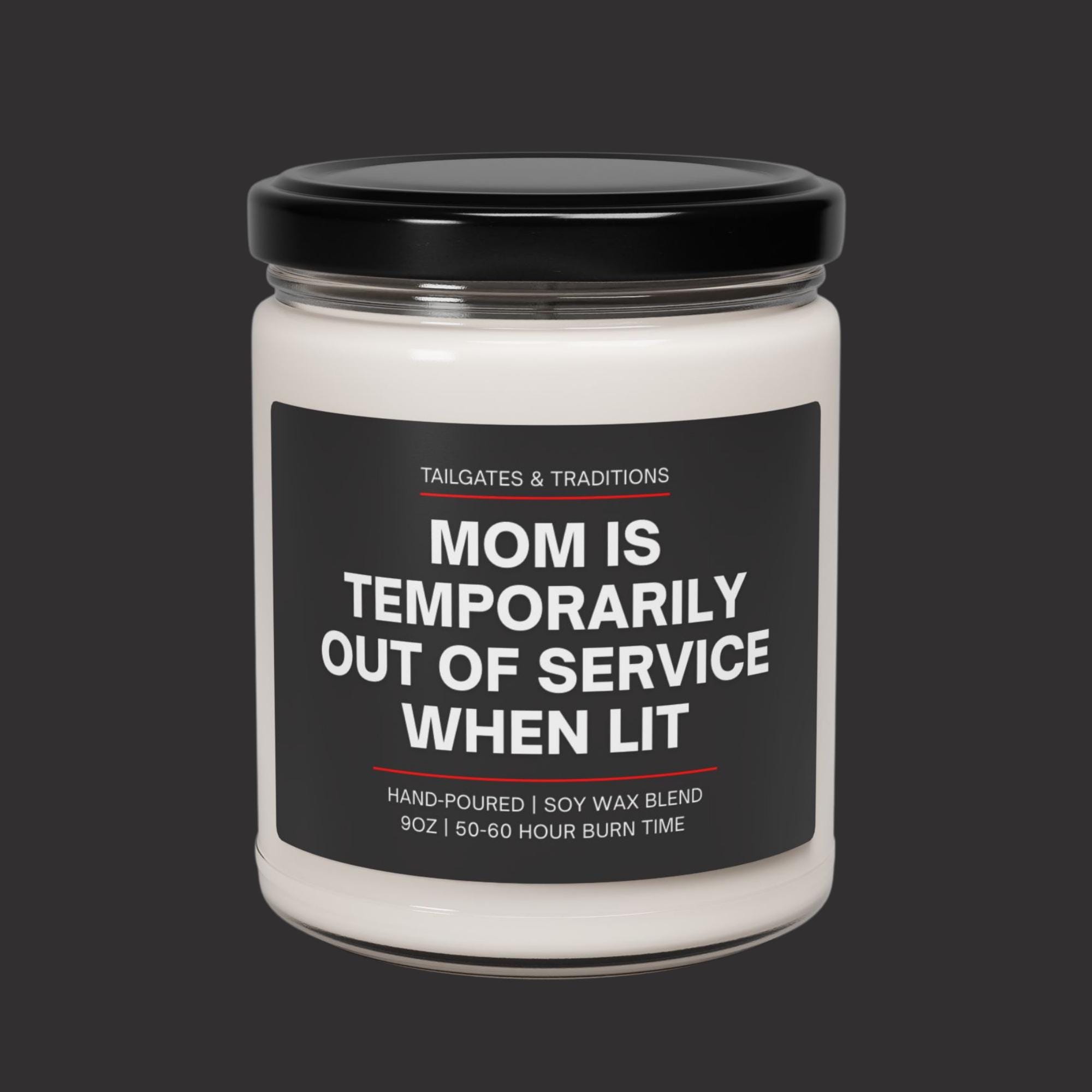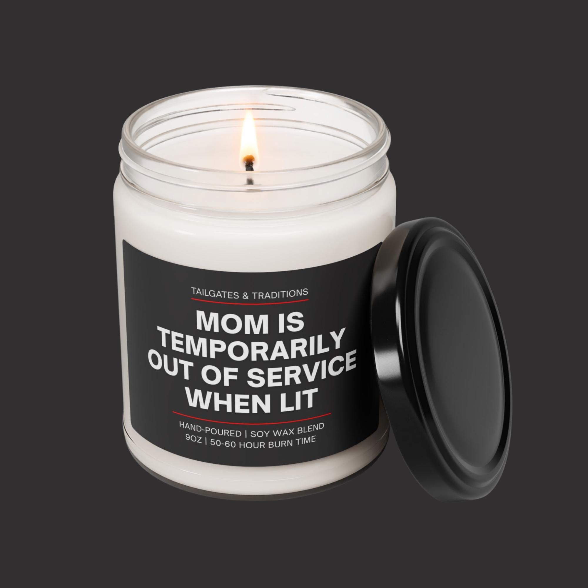 Mom is temporarily out of service when lit. This funny candle for mom is the perfect gift for busy days, celebrating mom life with a relatable mom quote, ideal as a gift for mom candle lovers, new mom candles, or a first time mom gift.