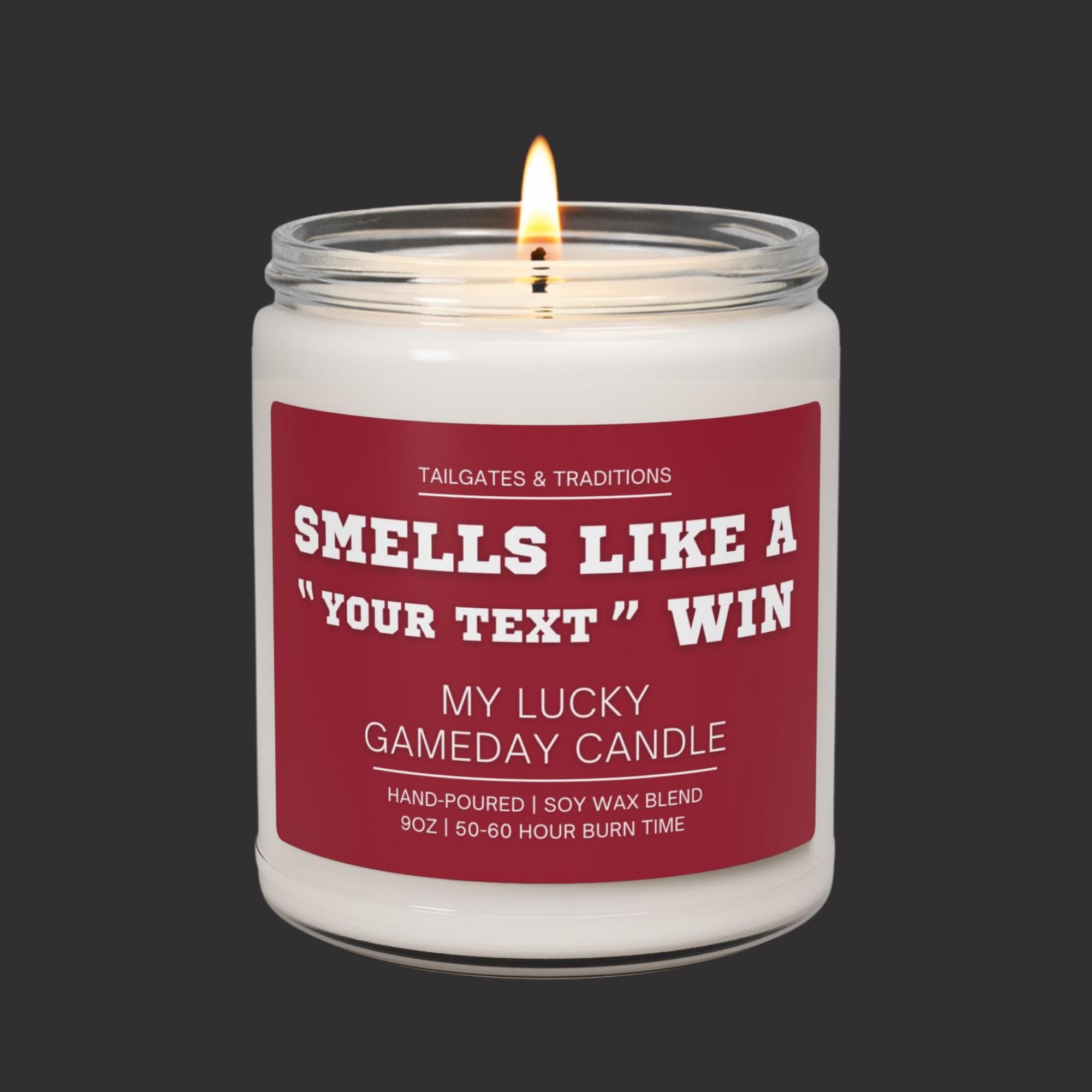 Bring the energy of gameday home with this personalized sports themed candle inspired by bold crimson and white colors. Add your favorite team’s name to the label to create a custom sports candle that feels like your lucky gameday tradition. Perfect for sports lovers, tailgate décor, and celebrating every big win with a scent that truly smells like victory.