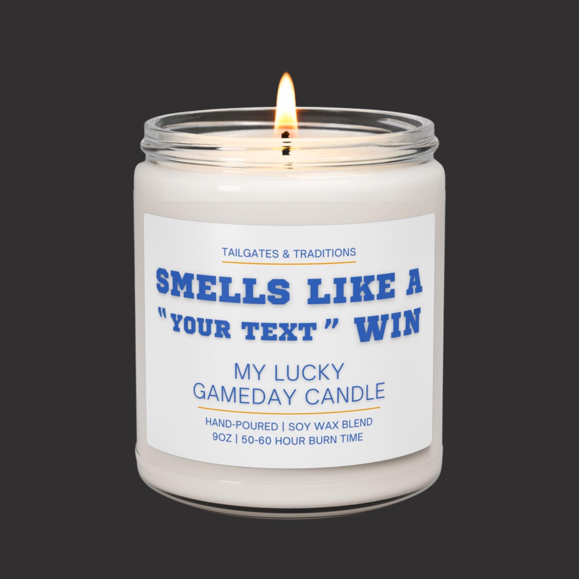 Our "Smells Like a Win" personalized sports candles are the ultimate addition to your gameday décor. This custom labeled sport themed gift, also known as "My Lucky Gameday Candle", is perfect for any die-hard college or pro sports fan. Light up this sport-themed candle and let the smell of victory fill the air, making every game day a winning experience.