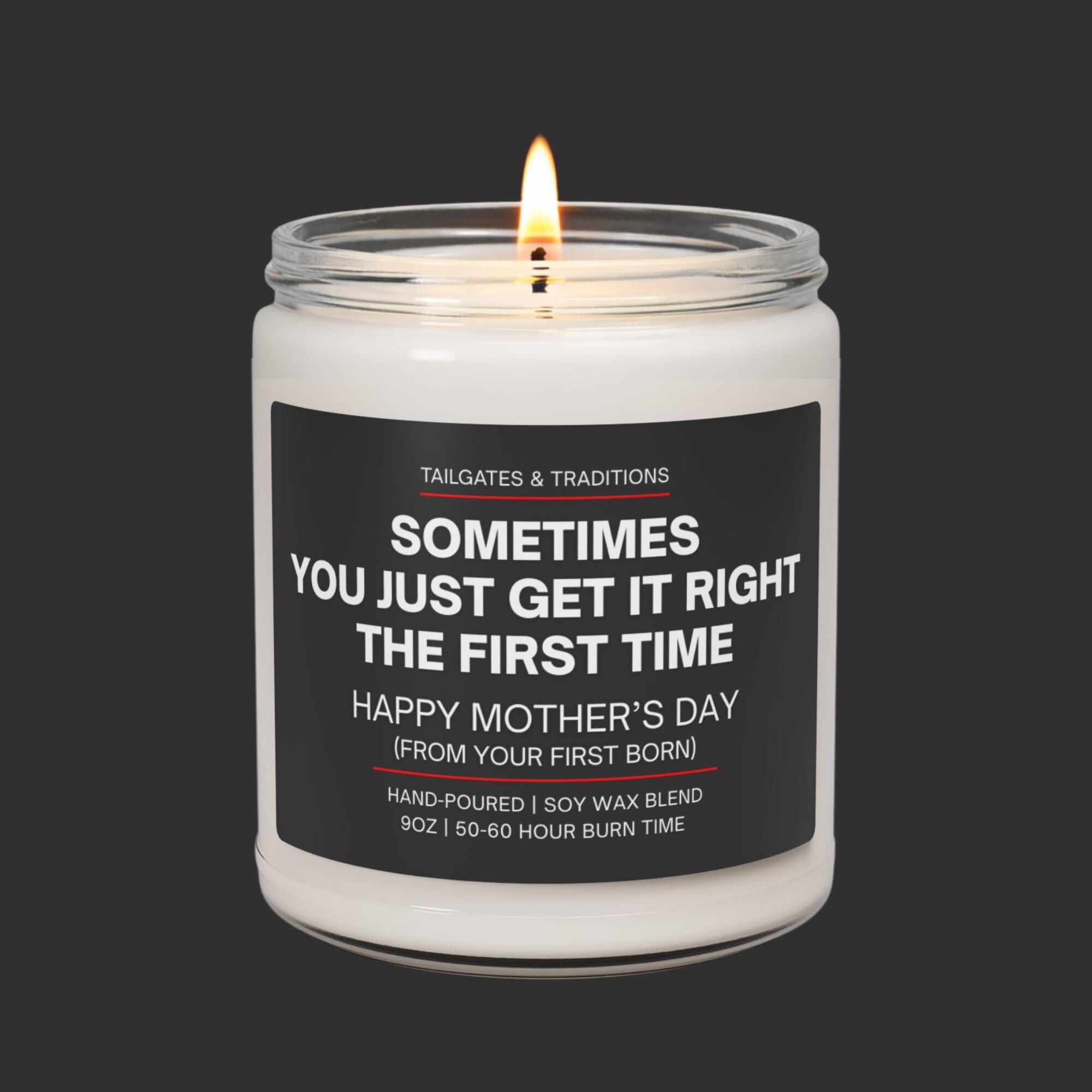 "Sometimes You Just Get It Right The First Time" scented candles are the perfect gift for Mother's Day, featuring a funny twist with a custom label that reads "Happy Mother's Day From Your First Born."